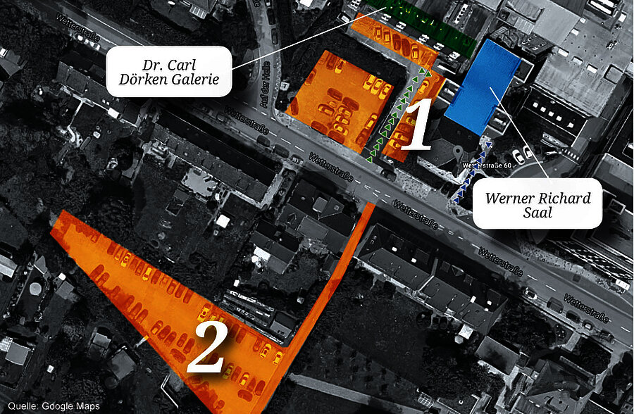 Von der A 45... Auf der Autobahn A45 kommend fahren Sie bis zur Ausfahrt DORTMUND SÜD. Dort folgen Sie den Hinweisschildern in Richtung Herdecke bis HERDECKE STADTMITTE. Im Stadtzentrum folgen Sie der Beschilderung in Richtung WETTER. Nach einer Unterführung auf der Wetterstraße liegt der Werner Richard Saal, die Dr. Carl Dörken Galerie sowie das Stiftungsgebäude nach ca. 200m auf der rechten Seite.