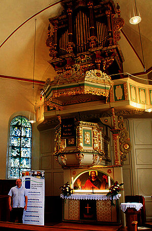 Pfarrer Guido Hofmann berichtet bei einem Treffen von der Notwendigkeit der Instandsetzung des historischen Orgelgehäuses und der Kanzel, welche durch Schimmelspuren erheblich beeinträchtigt werden. Der zu Rate gezogene Orgelsachverständige und Statiker stellte außerdem die Absenkung der gesamten Tribüne fest, die nun angehoben werden muss. Dies hat zur Folge, dass das Fundament neu gegossen werden muss.