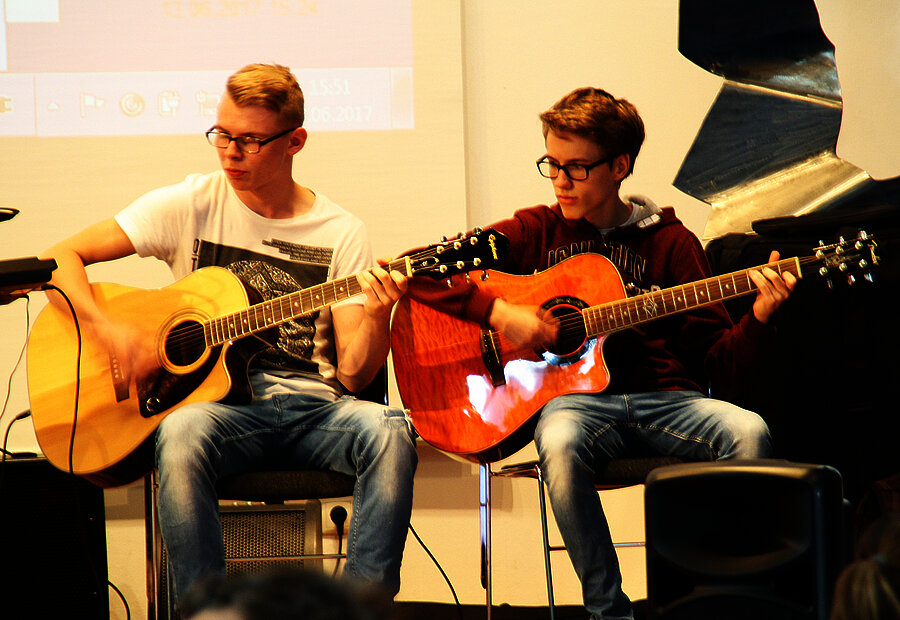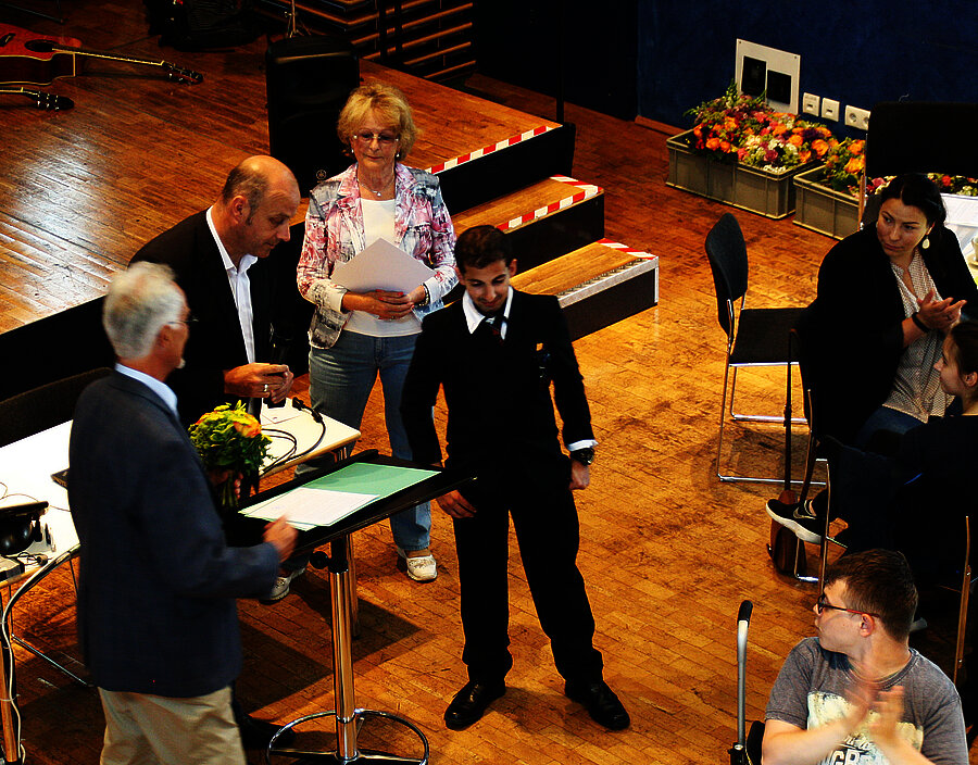 Zum Auftakt gab es 'etwas auf die Ohren' von der Schulband der Realschule am Bleichstein. Songs von Amy Winehouse und James Blunt boten einen gelungen Übergang zum anschließenden bunten Kuchenbuffet. Der bebilderten Schilderung des Ausfluges folgten die Auszeichnungsbegründungen durch die Klassenlehrer und die Preisübergabe durch den Vorstand der Werner Richard – Dr. Carl Dörken Stiftung: Dr. Jochen Plaßmann und Christa Stronzik.