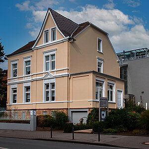 Sie sehen das gelbe Haus unserer Stiftung. Rechts davon liegt der Zugang zum Werner Richard Saal, links davon erreichen Sie den Zugang zur Dr. Carl Dörken Galerie.